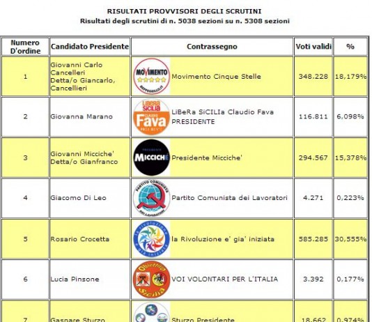 NELLO MUSUMECI PRESIDENTE 3514 4,03 PARTITO COMUNISTA DEI LAVORATORI 140 0,16 VOI VOLONTARI PER L'ITALIA 138 0,16 MOVIMENTO POLITICO CROCETTA PRESIDENTE 4232 4,86 MOVIMENTO...