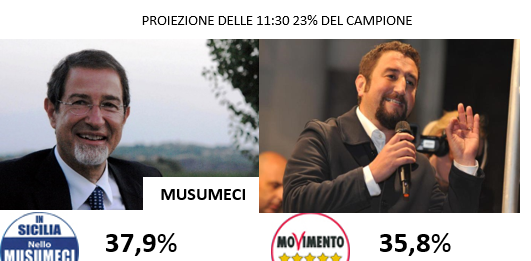 Arriva la nuova proiezione con il 23% del campione scrutinato, aumenta il vantaggio di Musumeci su Cancelleri la forchetta adesso è del 2,01% aspettiamo...
