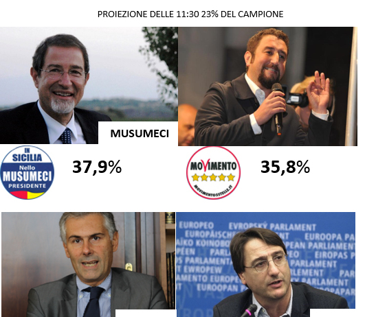 Le ultime proiezioni sul 37% del campione, ormai con una certa attendibilità, confermano la vittoria di Nello Musumeci.