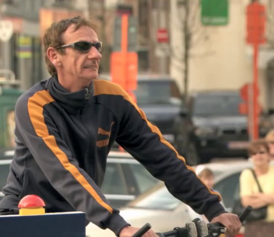 Un grande pulsante rosso al centro della piazza centrale di una piccola città belga con un cartello: "Premere per iniziare l'azione."